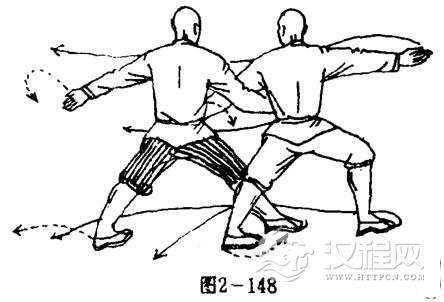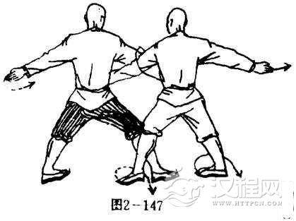 乙被甲撑捶后左脚内旋,右脚外旋,两腿成右弓步。左拳被撑展于左侧,拳心向前,拳眼向上,右掌不变.目视左侧方(图2-148).