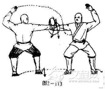 甲乙双方右脚向前上一步震脚落地,左脚抬起,体左转27度,两腿柑膝半蹲变成马步,同时,右掌随势推向右侧,掌心向右,掌指向上.左掌上架头上左侧,掌心斜向前,掌指向右.目视对方(图2-113).