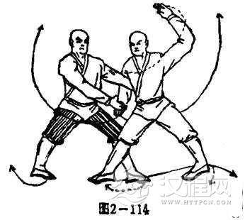 乙左脚跟旋碾,变成右横弓步。目视甲方(图2-114).