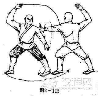 甲被乙推后,两脚为轴,体右转90度,两腿成右横弓步、同时,左掌被推落于右下侧,掌心向后,掌指向下,右掌架于头上右侧,掌心斜向上,掌指向右。目视乙方(图2-115).