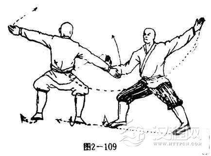 甲左脚跟外旋,体向右转90度,两腿成右弓步,同时,用右掌拍击乙方小嘴或者手腕,掌心斜向外,掌指斜向上,左掌在后向上展开,掌心向外,掌指斜向上.目视乙方(图2一109)。