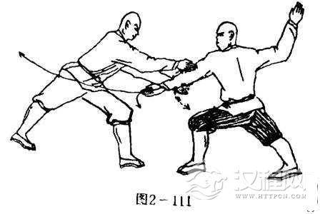 甲被乙推肩后,左掌心斜向右,掌指斜向下,向里开击乙方左掌,右掌展于体后右上侧,掌心向右,掌指向上.目视乙方(图2-111)。