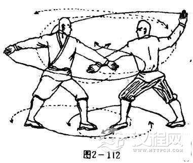 甲左掌再向外开,掌.白斜向右,掌指向前.目视乙方(图2-112).