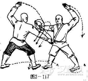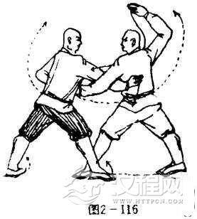 甲抬左脚脚跟内旋,震脚落地,两脚为轴,体左转90度,右脚上步落于乙方左脚后内侧,纬住乙左腿,两腿成右弓步,同时,左手腕外旋环弧缠住乙方左手碗,右掌由上向下压击乙方肘部,穿进乙方左腋下后侧,五指紧扣乙腰、背部不放。目视乙方(图2-116 ),