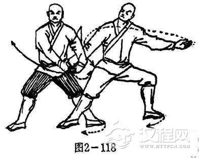 乙左脚尖外旋,两腿变成左横弓步,右掌被甲缠住,左掌下展于体左侧,掌心向前,掌指向左。目视乙方(图2一118).