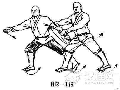 甲被乙按后,左脚尖内旋,两腿成右横弓步.同时,左手被抓.右掌外展于右下侧,掌心斜向下,掌指斜向右。目视右前侧(图2-119).