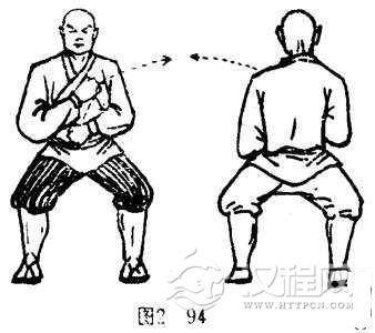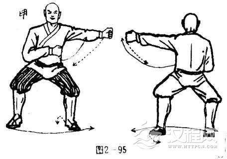 甲乙双方抬右脚原地震脚落地,左脚左移步,两腿屈膝半蹲变成马步,两臂屈时两掌变拳,楼护于体前,右拳在上,左拳在下,两拳心向内,拳眼向上.目视前方(图2-94)。
