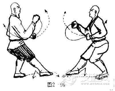 甲乙双方两脚眼地,体左转90度,右脚前上半步脚尖点地,成右虚步,同时右臂随势屈肘右拳挑撩于体前,拳心向左,拳眼斜向上,左臂屈肘左拳护于体前,拳心向右,拳眼斜向上.目视前方(图2-96).