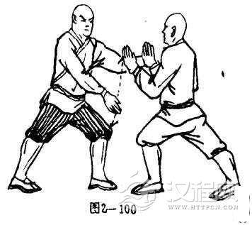 乙两腿原地弓步不变,左掌由前方向下开击甲方右手掌,掌心斜向下,掌指斜向前.目视乙方(图2-101 ).