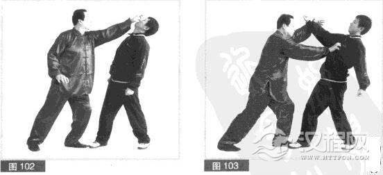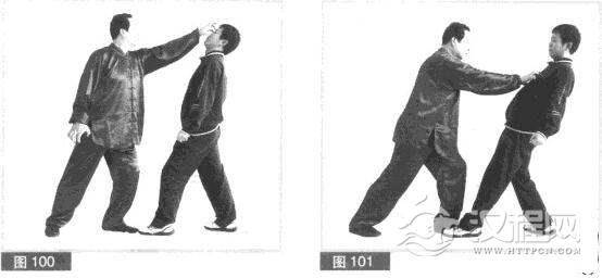 (2)对方急后仰头躲闪我抓击.同时用右拳向上捺挡我左手。我右脚向上跟步,同时用右手向前猛力抓击对方胸部。(图101)