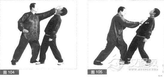 (5)对方惊慌中再次向后退左脚,我左脚再次迅速向前上步,并再次用左手抓击对方脸部。(图104)