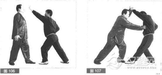 (1)我左前势对敌,对方左脚向前上步,同时左拳向前、向下劈打我头部。(图106)