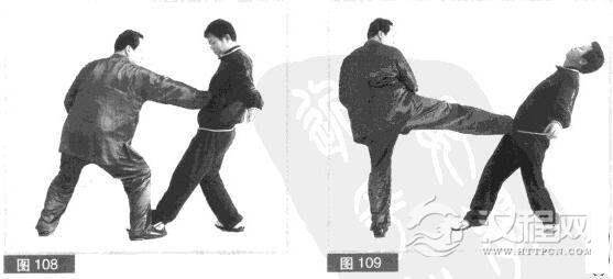 (4)对方左脚速向后退步躲我右拳击打。我左脚站稳,提右腿用右脚向右铲踢对方右腹肋部位。(图109)