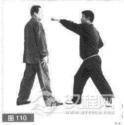 (1)双方均右前势对峙。对方使用连环技法,先用右手在我脸前虚晃,随即用左拳向前直击我头部。(图110)
