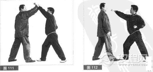 (2)我速用右小臂向上、向右迎挡对方左拳腕。(图111)