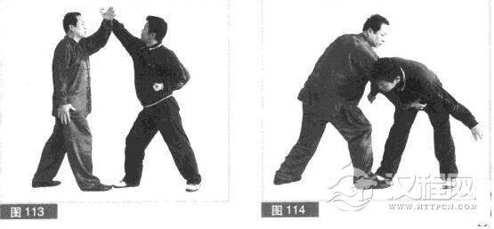 (4)我急用左小臂向上、向左迎挡.格开对方右拳击打。(图113)