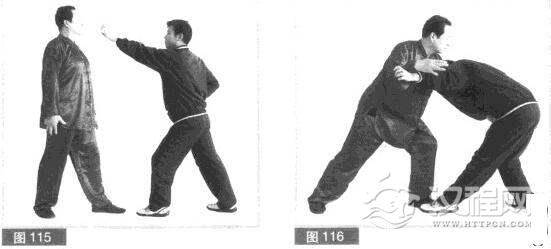 (2)我右手成掌,向上、向右抄持缠拧对方左小臂.上身快速下俯前探.用左拳向前撩打对方裆部。(图116)