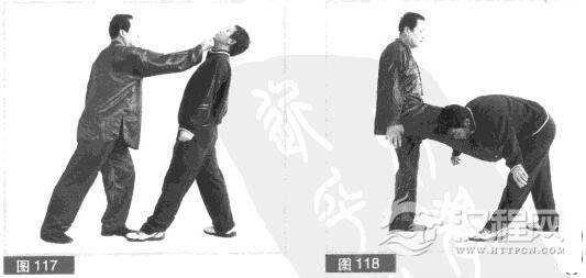 (3)对方急挣脱左臂.缩身躲闪我左拳击打;我趁对方缩下身之际,用右拳向前、向上攉打对方下颌部位。(图117)