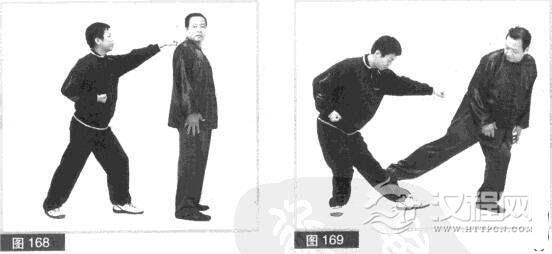 (1)双方前后站立。对方位于我身后用左拳向前击打我后脑部位。(图168)