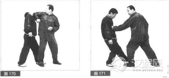 (3)对方急忙后滑左脚躲我跺踹。我趁对方后滑脚前俯头之机,右脚落地站稳,右臂屈肘,用肘尖向上顶撞对方下领部位。(图170)