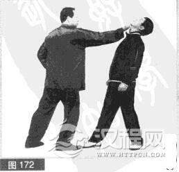 (2)面对我猛力击打,对方急忙向后仰头,同时右手成掌.臂内旋向上接抓我右小臂,并向右向下缠拧,欲对我使擒拿之技。(图173)