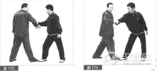 (3)我右竹手向对方缠拧方向稍作引力,化解对方缠拧之力;随即,我用全身揉动之力,举动右手臂外旋向右后方缠拧捋拽对方右小臂。(图174)
