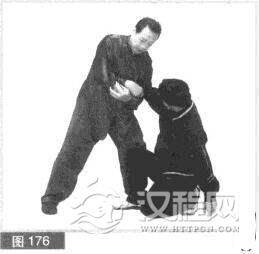 (5)紧接不停,我双手抓紧对方右掌、小臂,同时用力向前、向左、向下缠拧卷压,迫使对方受擒下蹲于地,动弹不得。(图176)