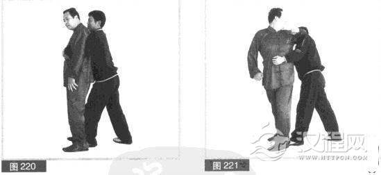 (1)双方前后站立,我前敌后。对方在我身后双臂抱住我胸部,并用力上抱,欲抱起摔倒我。(图220)