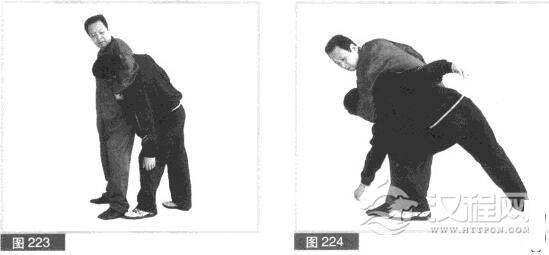 (5)为防对方向后坠身,我左臂夹住对方头部。猛力向前夹摔,同时向右、向前甩胯、拧腰、旋身,将对方摔于身前。(图224)