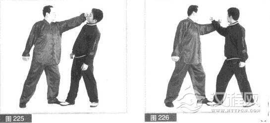 (1)对方右前势对我。我抢攻先打.左脚向前上步,同时左拳单峰贯耳横打对方右耳部位。(图225)