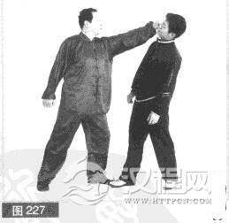 (2)对我迅猛击打,对方急用右拳向上、向右迎挡,防止我拳击打。(图226)