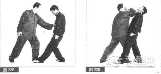 (5)对方急向后撤左脚躲我击打,并出右拳向前欲阻我进身。我用左拳向下、向左磕挂对方右拳,右脚快速向前上步,右臂屈肘用肘尖向前、向上挑击对方下颌部位。(图229)