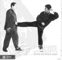(1)我左前势对敌,对方突起右脚,向前侧踹我小腹部位。(图211)