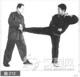 (2)我稍吞腹部化解对方踹击力.同时,我双手快速向下抓住对方右脚,左手抓后脚跟部位,右手抓脚掌部位。(图212)