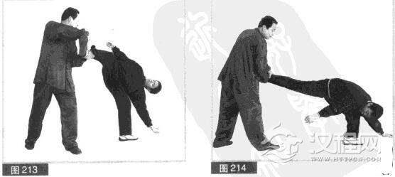 (4)对于对方的侧踹腿,还可用后拉腿破打之法,即我双手抓住对方右脚后,左脚速向后退一步,双手同时抓紧对方右脚,用力向后拉拽,迫使对手要么前倒,要么后倒,否则,身体要遭重创。(图214)