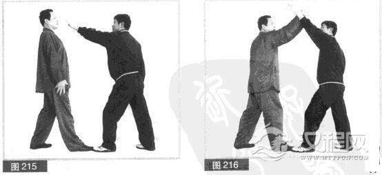 (1)我右前势对敌.对方先发出手,左脚向前上步.同时左手向前直抓我胸部。(图215)