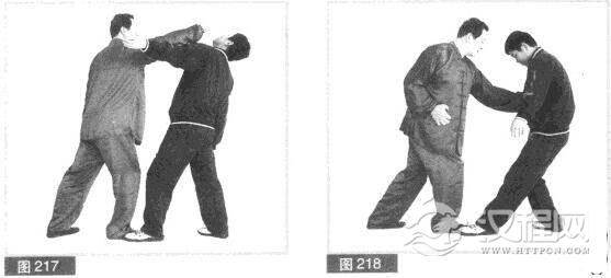 (3)我右小臂向上迎挡对方左手后不停.即用手掌向前、向下快速猛力拍击对方头部。(图217)