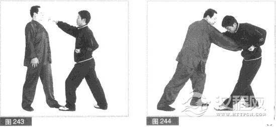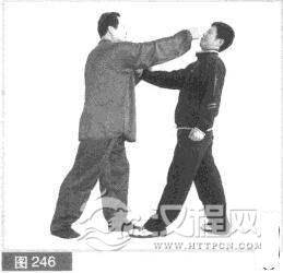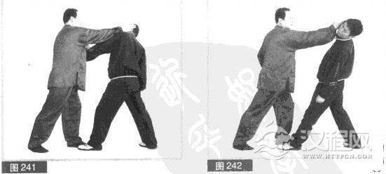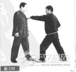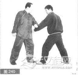 (2)我后吞胸化其拳力.同时用左拳向下砸击对方左拳。(图240)