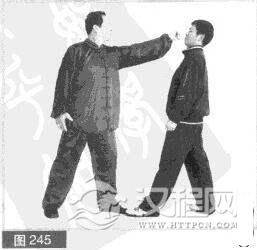(1)双方左前势对峙。我主动发打,左拳向前直击对方脸部。(图245)