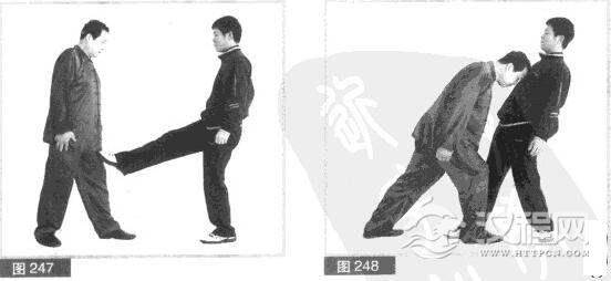 (3)对方边后仰头,边用左拳向上迎架,防我右拳击打,同时抬右腿用右脚向前弹踢我小腹部位。(图247)
