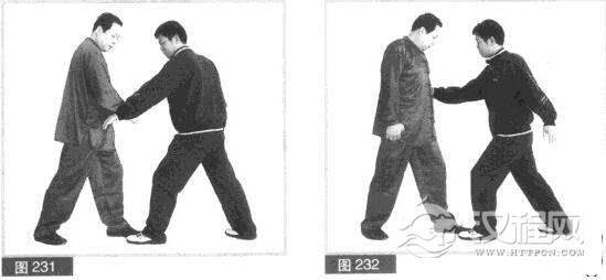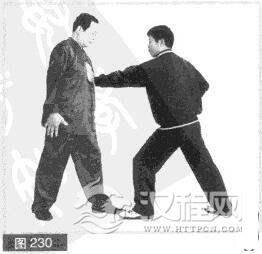 (1)双方左前势对峙,对方左手屈腕成立掌向前用力推击我胸部。(图230)