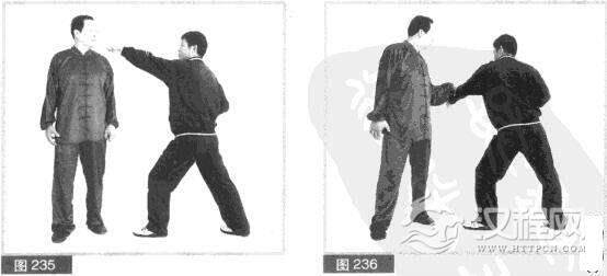 (2)我头稍右移闪开对方左拳击打,同时身体左转,左手成掌向上、向左抄捋缠抓对方左小臂。(图236)