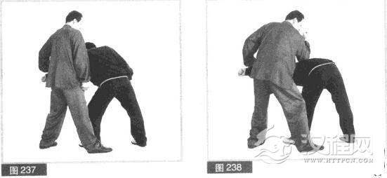 (4)对方为摆脱被动,欲用左脚向左瑞我小腿。在对方将动之际,我身体快速左转,右臂屈肘,用肘尖向左、向下砸击对方背部。(图238)