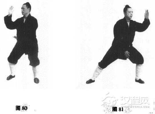 3.重心承在右脚,左脚向左边迈开一步(约尺半),同时,右手向上,左手朝下,依上述翻掌转臂原理划弧(图81)