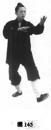 动作:腰身右转,重心右坐,左脚内扣,左手同左脚一起向正前方划动,左手内旋,由下至上后托掌推出,虎口张开,左脚经右脚前呈弧形迈出,虚脚尖以跟着地,右手由上向身体内侧旋臂压下,置左臂肘上,随后与左手来回搓推一次(图145)