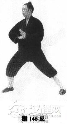 动作:以左后跟为轴,重心前移至左腿,身体由右向后转体270度,同时两手随身体转动而左手变拳,左手拂右拳上,右臂屈肘,当右脚转至360度位置时,后脚即承担重心,有背靠肘击之意,成右弓靠步(图146正、反)。