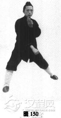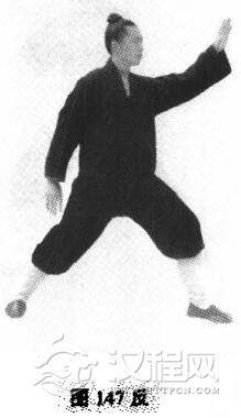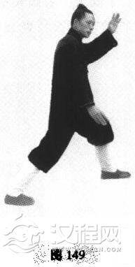 动作:接右搂膝拗步之式。以右脚为重心,左脚提起,往内再向外划走弧形步;同时左手外旋(掌心外翻),下拂反楼,再划回头前,.当左脚在左前方落定后承受重心,身体左转,右脚与右手同上,右脚在左前方一步(尺半许)处落脚,右手从搂膝肘的拗掌翻腕转臂变为捶,弧形往下击打,拳面朝里(图150)
