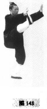 2.身体继续左转,提起右脚,从左侧上左手拍打脚面,再朝右外摆而出,在原脚前尺许落地;右手同时划弧,至落脚时搂膝,左手随落脚后以搂膝拗步式推出(图148、图149)