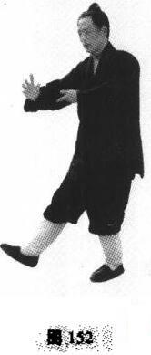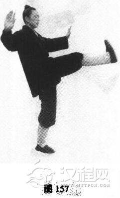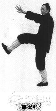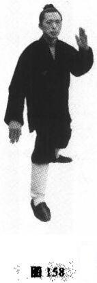 2,随起身而重心由左脚承受,右脚提起,与十字分脚相同(图157)