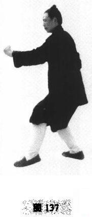 1.随着右掌竖起,身腰渐起,略右转,重心移至右脚,左脚随身体右转,同时从左从外向右前划大半回弧,至右脚前尺许,虚点地,左手随之在胸腰从左至右划平圆(图137)
